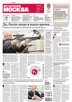 «Вечерняя Москва» — ежедневная российская вечерняя газета, старейшее из вечерних изданий в России, учрежденное в 1923 году. Выходит пять дней в неделю, кроме субботы и воскресенья. Отличается тем, что рассказывает о событиях еще не завершившегося дня. Оперативно освещает хронику и особенности жизни Москвы, охватывает все слои общества и большинство профессиональных и возрастных групп читателей.Издание представлено тремя выпусками – утренним ежедневным, вечерним (выходит три раза в неделю), еженедельным (выходит по четвергам).
