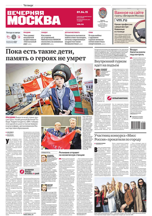 Еженедельный выпуск «Вечерней Москвы» — это значимые события недели, афиша города, новости из сферы отдыха и развлечений, телепрограмма с анонсами и комментариями, авторские колонки журналистов и авторитетные мнения экспертов, детская страничка, специальная рубрика «Золушка», интересные репортажи о необычных судьбах московских жителей, постоянные конкурсы и викторины.