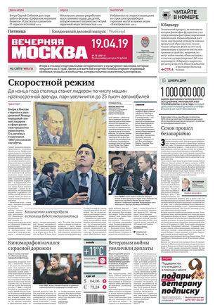 «Вечерняя Москва» — ежедневная российская вечерняя газета, старейшее из вечерних изданий в России, учрежденное в 1923 году. Выходит пять дней в неделю, кроме субботы и воскресенья. Отличается тем, что рассказывает о событиях еще не завершившегося дня. Оперативно освещает хронику и особенности жизни Москвы, охватывает все слои общества и большинство профессиональных и возрастных групп читателей.Издание представлено тремя выпусками – утренним ежедневным, вечерним (выходит три раза в неделю), еженедельным (выходит по четвергам).