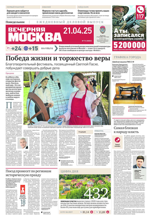 «Вечерняя Москва» — ежедневная российская вечерняя газета, старейшее из вечерних изданий в России, учрежденное в 1923 году. Выходит пять дней в неделю, кроме субботы и воскресенья. Отличается тем, что рассказывает о событиях еще не завершившегося дня. Оперативно освещает хронику и особенности жизни Москвы, охватывает все слои общества и большинство профессиональных и возрастных групп читателей.Издание представлено тремя выпусками – утренним ежедневным, вечерним (выходит три раза в неделю), еженедельным (выходит по четвергам).