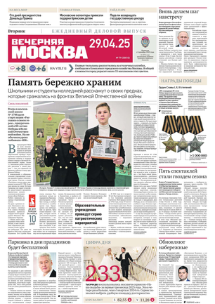 «Вечерняя Москва» — ежедневная российская вечерняя газета, старейшее из вечерних изданий в России, учрежденное в 1923 году. Выходит пять дней в неделю, кроме субботы и воскресенья. Отличается тем, что рассказывает о событиях еще не завершившегося дня. Оперативно освещает хронику и особенности жизни Москвы, охватывает все слои общества и большинство профессиональных и возрастных групп читателей.Издание представлено тремя выпусками – утренним ежедневным, вечерним (выходит три раза в неделю), еженедельным (выходит по четвергам).