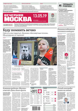 «Вечерняя Москва» — ежедневная российская вечерняя газета, старейшее из вечерних изданий в России, учрежденное в 1923 году. Выходит пять дней в неделю, кроме субботы и воскресенья. Отличается тем, что рассказывает о событиях еще не завершившегося дня. Оперативно освещает хронику и особенности жизни Москвы, охватывает все слои общества и большинство профессиональных и возрастных групп читателей.Издание представлено тремя выпусками – утренним ежедневным, вечерним (выходит три раза в неделю), еженедельным (выходит по четвергам).