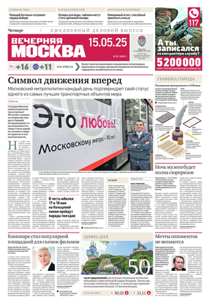 «Вечерняя Москва» — ежедневная российская вечерняя газета, старейшее из вечерних изданий в России, учрежденное в 1923 году. Выходит пять дней в неделю, кроме субботы и воскресенья. Отличается тем, что рассказывает о событиях еще не завершившегося дня. Оперативно освещает хронику и особенности жизни Москвы, охватывает все слои общества и большинство профессиональных и возрастных групп читателей.Издание представлено тремя выпусками – утренним ежедневным, вечерним (выходит три раза в неделю), еженедельным (выходит по четвергам).