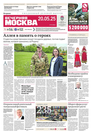 «Вечерняя Москва» — ежедневная российская вечерняя газета, старейшее из вечерних изданий в России, учрежденное в 1923 году. Выходит пять дней в неделю, кроме субботы и воскресенья. Отличается тем, что рассказывает о событиях еще не завершившегося дня. Оперативно освещает хронику и особенности жизни Москвы, охватывает все слои общества и большинство профессиональных и возрастных групп читателей.Издание представлено тремя выпусками – утренним ежедневным, вечерним (выходит три раза в неделю), еженедельным (выходит по четвергам).