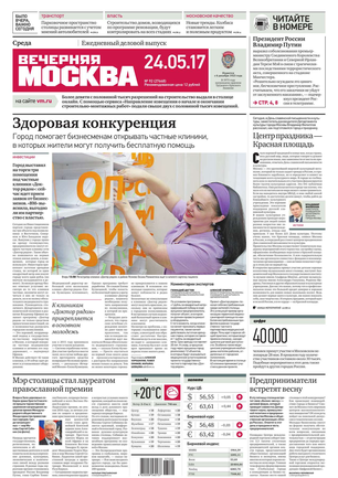«Вечерняя Москва» — ежедневная российская вечерняя газета, старейшее из вечерних изданий в России, учрежденное в 1923 году. Выходит пять дней в неделю, кроме субботы и воскресенья. Отличается тем, что рассказывает о событиях еще не завершившегося дня. Оперативно освещает хронику и особенности жизни Москвы, охватывает все слои общества и большинство профессиональных и возрастных групп читателей.Издание представлено тремя выпусками – утренним ежедневным, вечерним (выходит три раза в неделю), еженедельным (выходит по четвергам).