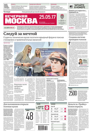 «Вечерняя Москва» — ежедневная российская вечерняя газета, старейшее из вечерних изданий в России, учрежденное в 1923 году. Выходит пять дней в неделю, кроме субботы и воскресенья. Отличается тем, что рассказывает о событиях еще не завершившегося дня. Оперативно освещает хронику и особенности жизни Москвы, охватывает все слои общества и большинство профессиональных и возрастных групп читателей.Издание представлено тремя выпусками – утренним ежедневным, вечерним (выходит три раза в неделю), еженедельным (выходит по четвергам).