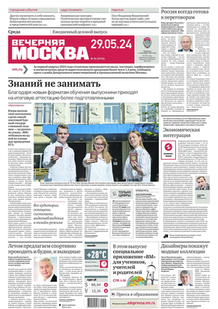 «Вечерняя Москва» — ежедневная российская вечерняя газета, старейшее из вечерних изданий в России, учрежденное в 1923 году. Выходит пять дней в неделю, кроме субботы и воскресенья. Отличается тем, что рассказывает о событиях еще не завершившегося дня. Оперативно освещает хронику и особенности жизни Москвы, охватывает все слои общества и большинство профессиональных и возрастных групп читателей.Издание представлено тремя выпусками – утренним ежедневным, вечерним (выходит три раза в неделю), еженедельным (выходит по четвергам).