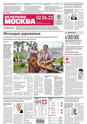 «Вечерняя Москва» — ежедневная российская вечерняя газета, старейшее из вечерних изданий в России, учрежденное в 1923 году. Выходит пять дней в неделю, кроме субботы и воскресенья. Отличается тем, что рассказывает о событиях еще не завершившегося дня. Оперативно освещает хронику и особенности жизни Москвы, охватывает все слои общества и большинство профессиональных и возрастных групп читателей.Издание представлено тремя выпусками – утренним ежедневным, вечерним (выходит три раза в неделю), еженедельным (выходит по четвергам).