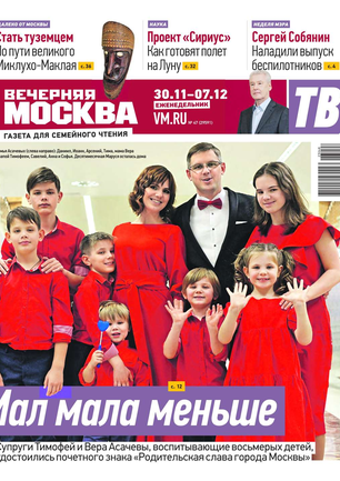 Еженедельный выпуск «Вечерней Москвы» — это значимые события недели, афиша города, новости из сферы отдыха и развлечений, телепрограмма с анонсами и комментариями, авторские колонки журналистов и авторитетные мнения экспертов, детская страничка, специальная рубрика «Золушка», интересные репортажи о необычных судьбах московских жителей, постоянные конкурсы и викторины.