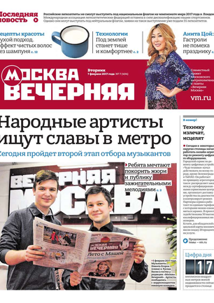 «Вечерняя Москва» — ежедневная российская вечерняя газета, старейшее из вечерних изданий в России, учрежденное в 1923 году. Выходит пять дней в неделю, кроме субботы и воскресенья. Отличается тем, что рассказывает о событиях еще не завершившегося дня. Оперативно освещает хронику и особенности жизни Москвы, охватывает все слои общества и большинство профессиональных и возрастных групп читателей.Издание представлено тремя выпусками – утренним ежедневным, вечерним (выходит три раза в неделю), еженедельным (выходит по четвергам).
