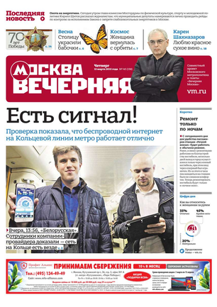 «Вечерняя Москва» — ежедневная российская вечерняя газета, старейшее из вечерних изданий в России, учрежденное в 1923 году. Выходит пять дней в неделю, кроме субботы и воскресенья. Отличается тем, что рассказывает о событиях еще не завершившегося дня. Оперативно освещает хронику и особенности жизни Москвы, охватывает все слои общества и большинство профессиональных и возрастных групп читателей.Издание представлено тремя выпусками – утренним ежедневным, вечерним (выходит три раза в неделю), еженедельным (выходит по четвергам).