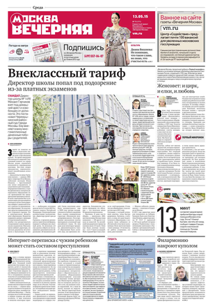 «Вечерняя Москва» — ежедневная российская вечерняя газета, старейшее из вечерних изданий в России, учрежденное в 1923 году. Выходит пять дней в неделю, кроме субботы и воскресенья. Отличается тем, что рассказывает о событиях еще не завершившегося дня. Оперативно освещает хронику и особенности жизни Москвы, охватывает все слои общества и большинство профессиональных и возрастных групп читателей.Издание представлено тремя выпусками – утренним ежедневным, вечерним (выходит три раза в неделю), еженедельным (выходит по четвергам).