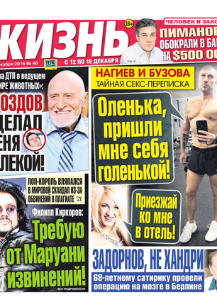 Еженедельная газета, предназначенная для семейного чтения. Основные рубрики: самые скандальные и интересные события прошедшей недели, политический комментарий Леонида Шахова, пикантные истории из звездной жизни, советы профессионального психолога, действенные рецепты здоровья, гороскоп, кроссворд, конкурсы, сканворды, розыгрыши билетов в кинотеатры и множество других призов. Приложения к газете «Жизнь»: «Телеэкран» - телепрограмма с подробными анонсами кино и сериалов, «Овертайм» - спортивное обозрение.