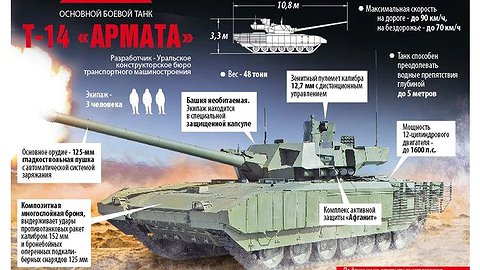 А еще Т-14 оснащен зенитным пулеметом калибра 12,7 мм с дистанционным управлением и дальностью поражения воздушных целей до 1,5 км, а также спаренным с пушкой пулеметом калибра 7,62 мм для уничтожения пехоты противника. Дальность стрельбы пушки - около 7 км снарядами и более 12 км противотанковыми ракетами.