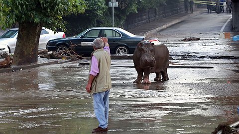 Поначалу, после удара стихии, случившееся здесь казалось голливудским сценарием: выйдя на улицы утром, тбилисцы увидели львов, тигров и даже бегемота. Звери, которым удалось спастись из ушедшего под воду зоопарка, в панике носились по спальному району. А над городом в поисках сбежавших хищников несколько дней барражировал вертолет.