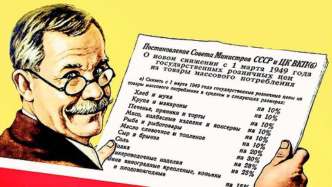 1 марта 1949 г. началось второе плановое снижение цен. В памяти оно стало первым «настоящим» обвалом цен. Да, потом будут ещё и ещё — всего в послевоенном СССР цены снижали 6 (!) раз — вплоть до 1953 г., обычно в марте или апреле. 1 апреля 1953 г. снижение цен было самым крупным. Оно произошло уже после смерти Сталина, однако основные параметры с ним были согласованы. Глава СССР в обозримой перспективе вообще хотел некоторые жизненно важные продукты, как, например, хлеб, сделать бесплатными.