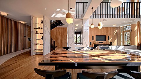 Потолок в гостиной отделали светлым дубом: дерево эффектно подчеркнуло скатную конструкцию с крутым наклоном и проёмы окон в кровле, освещающие холл второго этажа. Этот же материал пошёл и на отделку стен и полов на обоих этажах, связав воедино сложную архитектуру дома. В комплект к дубу выбрали фактуру классического каррарского мрамора и контрастные чёрные элементы. Большую часть мебели сделали специально для интерьера по эскизам архитектора: обеденные столы, кухню, корпусную мебель для спален. «Стиль интерьера я бы назвала эко–шик,—делится размышлениями Александра.—Мне он близок и понятен, как и стиль бохо, веяния которого сегодня очень актуальны. Люди сейчас стали придерживаться здорового образа жизни, хотят видеть соответствующую атмосферу у себя дома. Мне эти тенденции нравятся, и я стараюсь насыщать интерьеры природными материалами, фактурами, вещами ручной работы—это даёт ощущение уюта, тепла, тактильности, визуальной естественности».