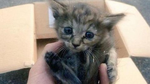 Но мимо шел человек и увидел серое существо на слабых лапах, с взъерошенной шерсткой и трагическими глазами. Существо раскрывало маленький рот и мяукало. Человек подобрал котенка и на ладони принес его домой.