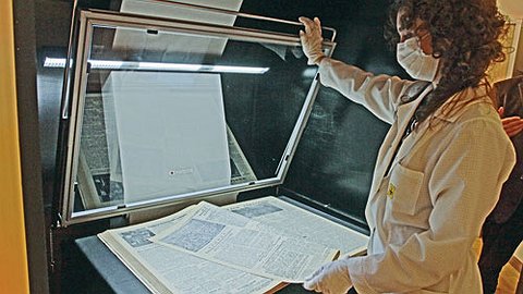 Сначала подшивки «Ленправды», как и любых других газет, поступивших на сканирование, постранично просматривают на наличие дефектов, степень сохранности, а затем передают в отдел сканирования. Там с ними работают квалифицированные операторы. В первую очередь подшивки обеззараживают и обеспыливают, то есть каждую страницу чистят специальным прибором наподобие пылесоса. Как правило, большинство документов нуждается в такой процедуре. Для этого есть специальное оборудование. Работа с документами идет только в ручном режиме.