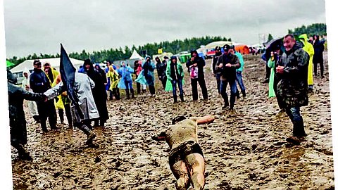 Но последней каплей, вишенкой на торте, или, если угодно, соломинкой, сломавшей хребет терпения русского рокера, стала парковка. Точнее, ее отсутствие. 15 тысяч авто, приехавших на фестиваль, буквально перепахали предназначенную для стоянки поляну и все подъезды к месту действия. Земля от длительных дождей вконец раскисла. Внедорожники проваливались по днище.