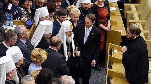 Главным участником встреч был патриарх Кирилл, который впервые побывал в Госдуме. Его предшественник Алексий II посещал парламент в 2004 году, когда пообщался с депутатами в Малом зале Госдумы. Вчера для патриарха Кирилла был открыт зал пленарных заседаний, где он выступил с главной думской трибуны. Прежде всего, он призвал депутатов к сотрудничеству в защите норм традиционной морали, так как от их "активной позиции будет зависеть способность страны устоять перед лицом современных псевдоценностей, губительных для личности и человеческой цивилизации в целом". Одной из спасительных мер патриарх считает школьный курс "Основы религиозной культуры и светской этики", который, по его мнению, следует преподавать не только в четвертом классе, как сейчас, но и все годы обучения в школе: "Этот курс рассчитан не только на воспитание нравственного сознания ребенка, но и национального самосознания".