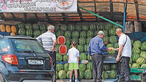 "Никакого дефицита арбузов и дынь нет. Всего хватает. Узбекские дыни уже отходят, киргизские завозят", - поделились торговцы на оживленной улице густонаселенного Октябрьского района города, прокричав вслед: "Девушка, куда вы пошли?! Арбузы очень сладкие! Не уходите без них!".