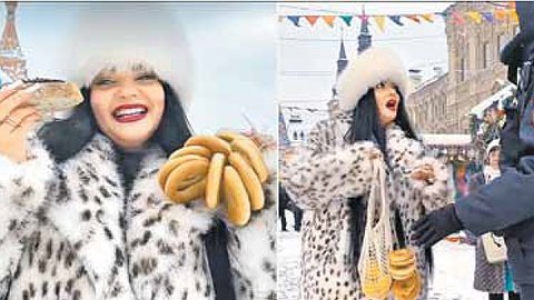 Она не просто надела шубу и шапку, но и хохломской ложкой намазывала на хлеб красную икру из 14-килограммового контейнера, принесенного с собой. Видео «раскидистой клюквы» набрало больше четырех миллионов просмотров, даже Роман Путин, которого называют племянником президента, поинтересовался, вкусный ли бутерброд.