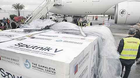 Поставки российской вакцины за рубеж должны резко вырасти к концу весны (на фото - 30 000 доз Sputnik V прибывают в аэропорт Карфаген в Тунисе)