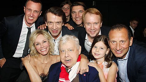 Спартаковцы дарят красно-белый шарф и абонемент на игры сезона. Верник грозит, что весь театр придет на футбол. Спартаковцы от такой перспективы не дрогнули. Министр культуры Москвы Кибовский в своей речи гордится, что начал свою деятельность в эру Табакова. А кто, скажите, не рад быть с ним, при нем, под его крылом? С Табаковым надежно и безбедно — он, между прочим, один такой в Москве, кто на детей всех без исключения сотрудников деньги доплачивает. А еще квартиры артистам выбивает.
